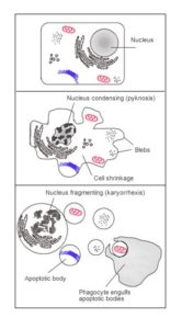 In an article published in 1972, John F. Kerr, Andrew H. Wyllie and A. R. Currie, coined the term “apoptosis” in order to differentiate naturally occurring developmental cell death from the necrosis that results from acute tissue injury. They adopted the Greek word for the process of leaves falling from trees or petals falling from flowers. The word apoptosis is a combination of the prefix ‘apo‘ and the root ‘ptosis‘. Apo means away, off or apart. Ptosis means to fall. So then, the closest translation of apoptosis is “to fall apart”.