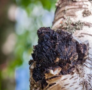 Chaga (Inonotus obliquus) is a distinctive mushroom known for its health benefits and unique appearance. The word itself, tschaga, is of Russian origin, borrowed from northeastern dialect called Komi and it simply means “mushroom”. Chaga grows primarily on birch trees in cold climates, such as Siberia, northern Europe, and parts of North America. Chaga has a hard, black, crusty exterior that resembles burnt charcoal, while its inner core is a soft, orange-brown color. This unusual appearance has led to the mushroom being referred to as “the king of medicinal mushrooms” in some traditional herbal practices. This growth is also called a “conk”, and Chaga is also known as black mass, clinker polypore, birch canker polypore or cinder conk.