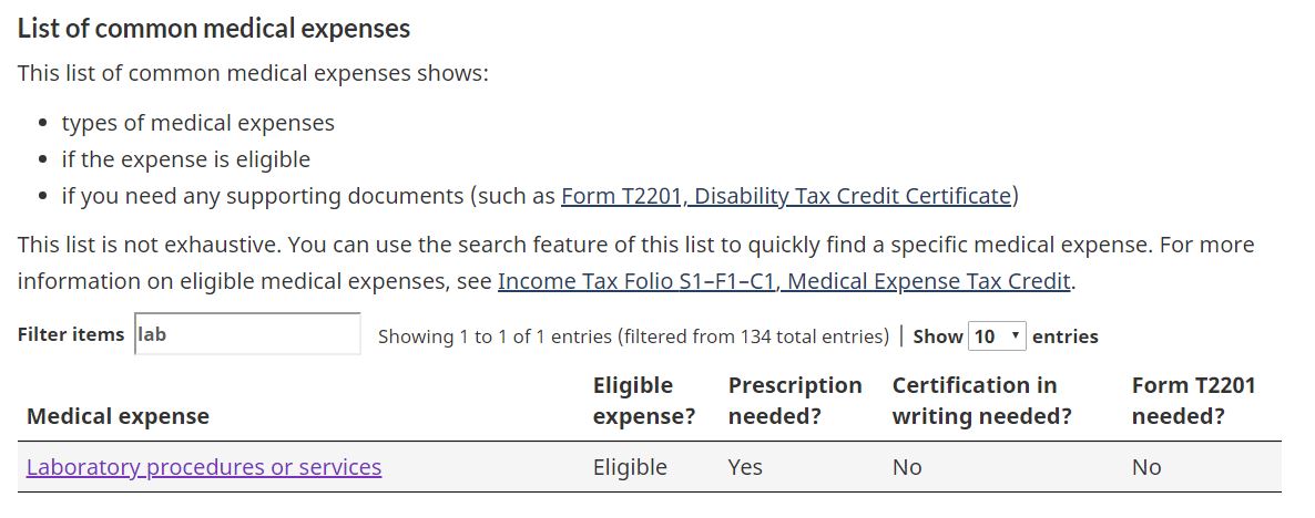 Labs are tax-deductible with CRA. Please save the invoice and give it to the person who does your taxes. Again, labs only.