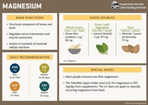 Magnesium is involved in more than 300 essential metabolic reactions, of which the followings are the most important: energy production, synthesis of essential molecules, structural roles (in bone, cell membranes, and chromosomes), ion transport across cell membrane, cell signaling and cell migration.