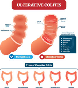 This is a disease that causes inflammation and sores (ulcers) in the lining of the large intestine (colon). It usually affects the lower section (sigmoid colon) and the rectum. But it can affect the entire colon. In general, the more of the colon that’s affected, the worse the symptoms will be.