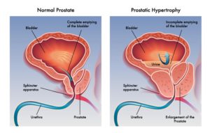 Benign prostatic hyperplasia (BPH), also known as benign prostatic hypertrophy, is an enlarged prostate gland. The prostate gland, the size and shape of a walnut, surrounds the urethra, the tube that carries urine from the bladder out of the body. As the prostate gets bigger, it may squeeze or partly block the urethra. This often causes problems with urinating.