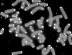 Chromosomes (grey) shown with their telomeres (white dots) at the end